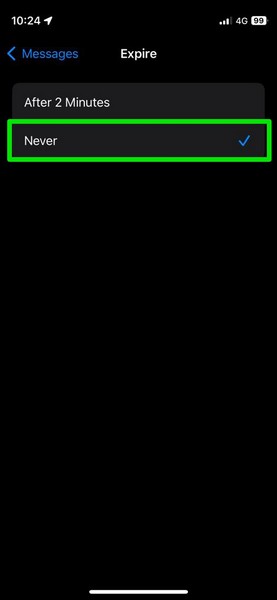 4。次のページで、をタップします一度もないiOS 17のiPhoneでオーディオメッセージの自動expiryとして設定するオプション。