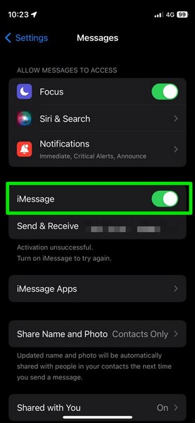 4。有効になっていない場合、トグルをタップしますimessageを有効にする。