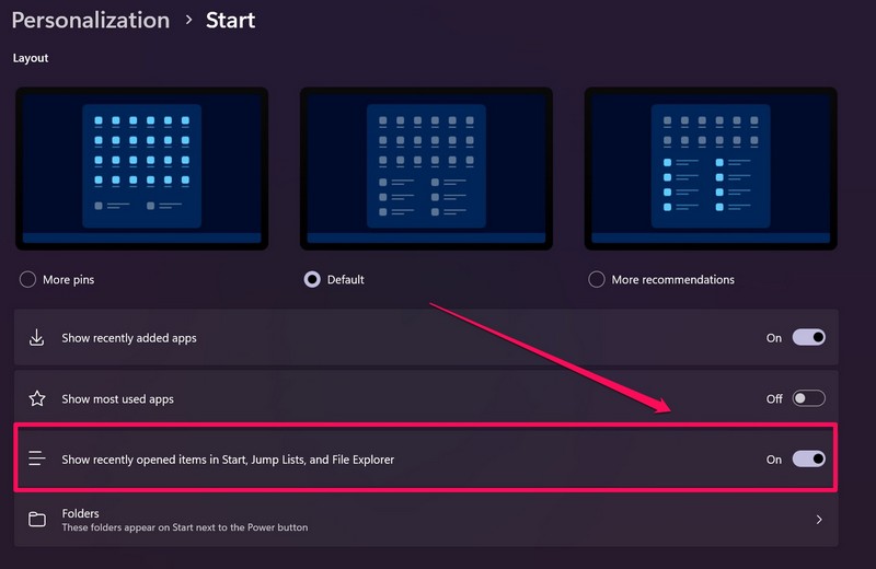 Windows 11でジャンプリストに直面しているときにチェックしたいと思うかもしれない2番目のことは、デバイスで機能が有効になっているかどうかを確認することです。そうでない場合は、すぐの手順に従ってすぐに有効にしてください!