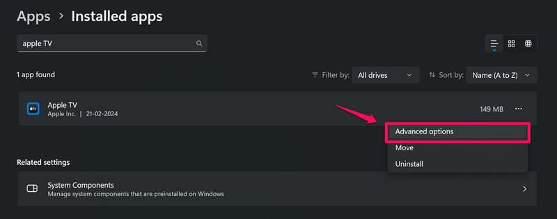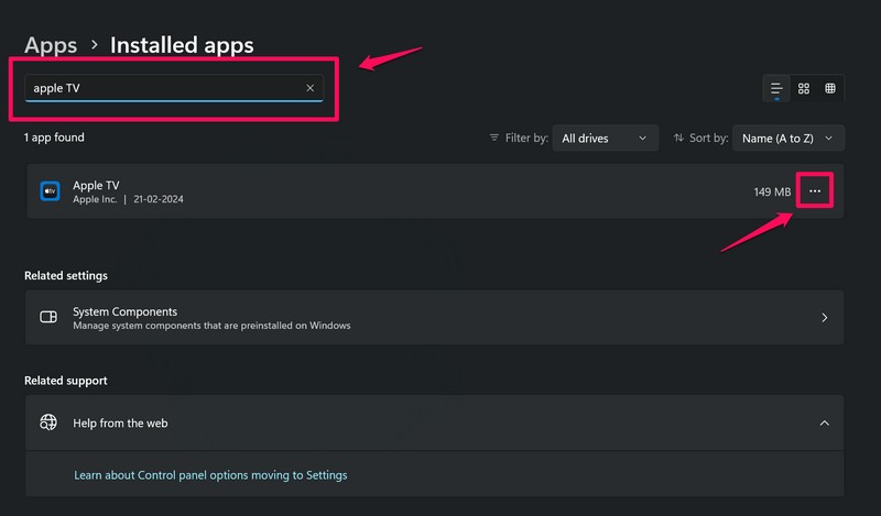 3。上記の検索バーを使用して影響を受けるアプリケーションを見つけ、オーバーフロー(3ドット)ボタンその隣。