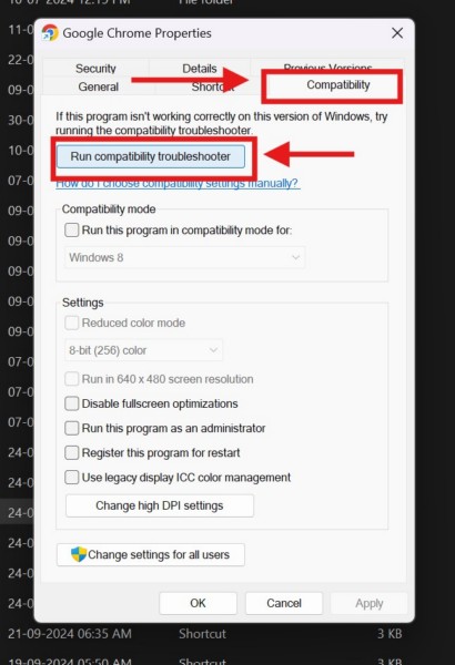 1.手順1-3を使用します前の修正から(修正#2)を開く互換性タブWindows 11 PCまたはラップトップの影響を受けるアプリのプロパティウィンドウ。