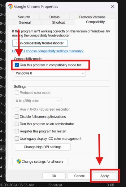 6。ここ、ボックスを確認してくださいのためにこのプログラムは、オプションの互換モードで実行しますクリックします適用ボタン下に。