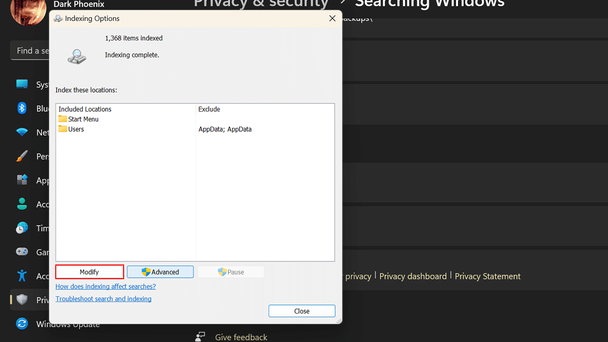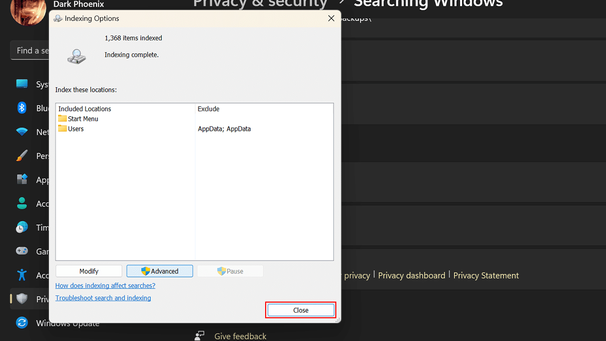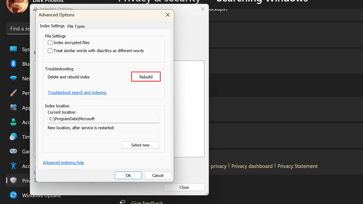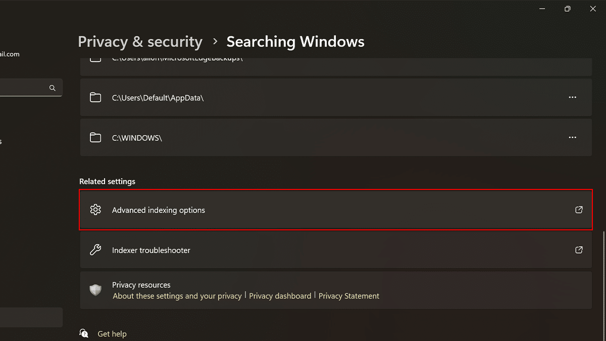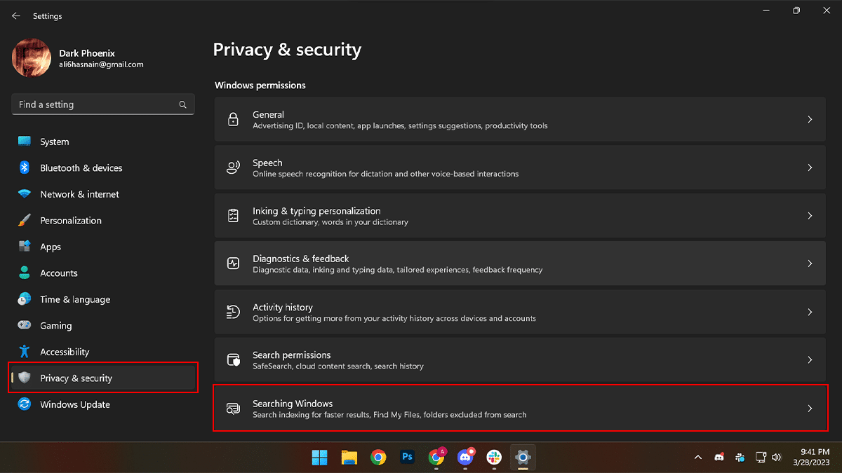 - クリックしてくださいプライバシーとセキュリティ左側のペインで>「Windows Permissions」セクションの下>Windowsの検索タブ。