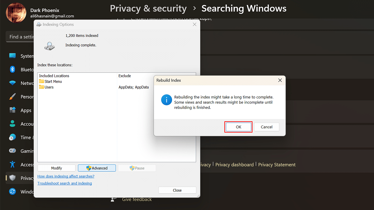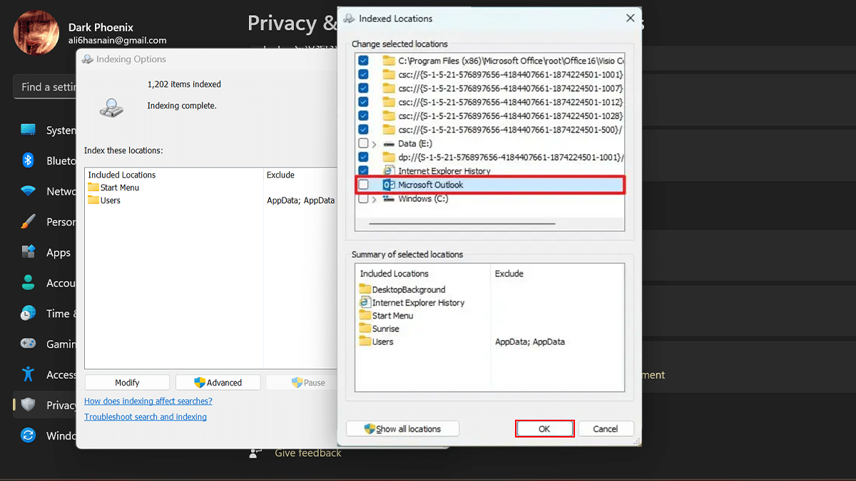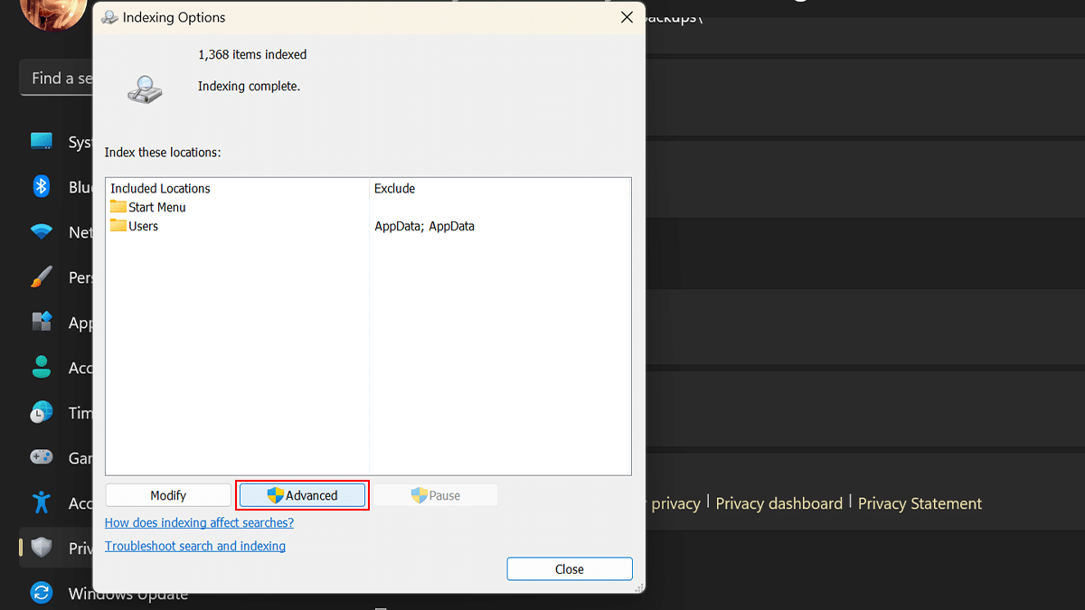 - [関連設定]セクションの下> [オン]をクリックします高度なインデックス作成オプション。