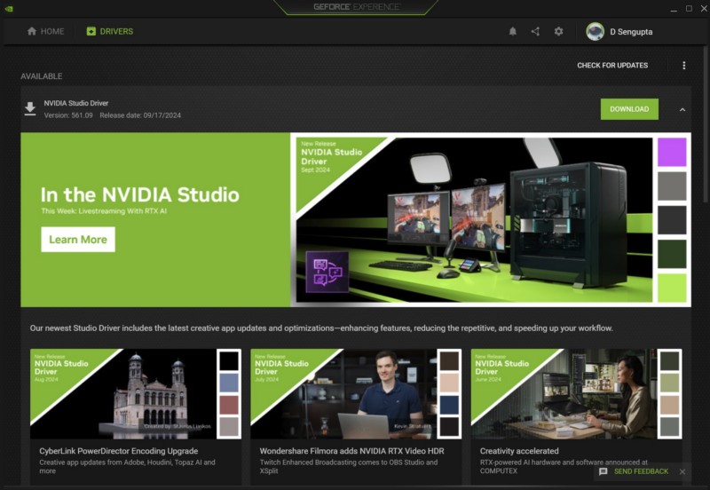 したがって、AMDグラフィックカードを使用している場合は、アドレナリンソフトウェアドライバーを更新します。同様に、nvidia GPUをお持ちの場合は、を使用しますGeForce Experienceアプリ最新のドライバーの更新を確認し、デバイスにインストールします。
