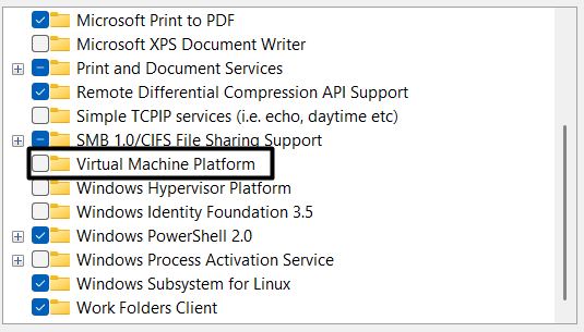 4。でWindows機能プロンプト、探してください仮想マシンプラットフォームそして、その隣のボックスを確認してください。