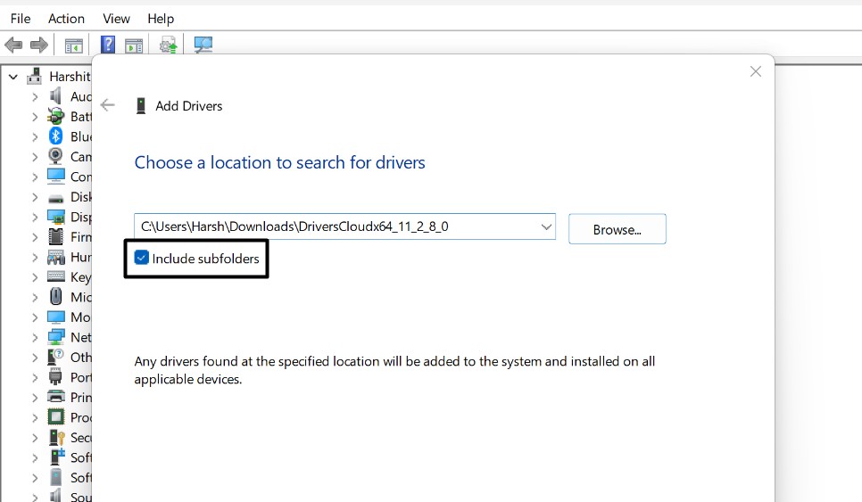 8。選択したら、クリックしますわかりましたボタン、次にマークを確認しますサブフォルダーを含めますチェックボックス。