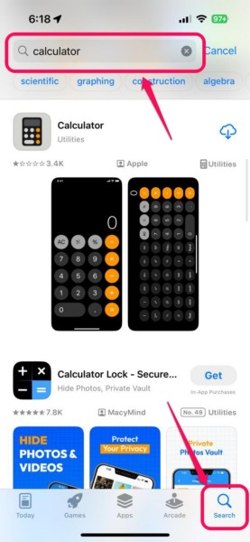6。に行きます[検索]タブ下のナビゲーションバーと検索バーを使用しますを見つける電卓アプリ。
