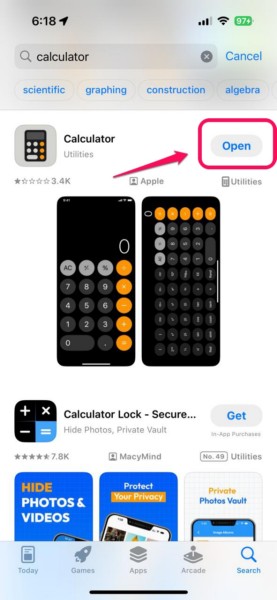 8。インストールが完了したら、タップします開いたボタン計算機アプリを起動し、Maths Notes機能が機能しているかどうかを確認します。