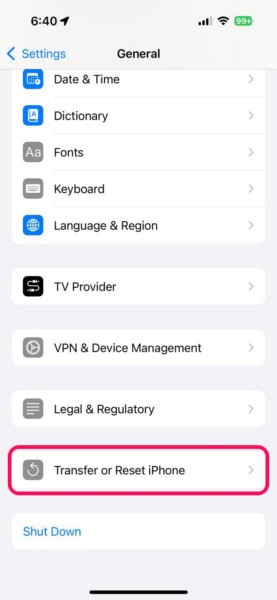 3。次のページを下にスクロールして、を見つけますiPhoneを転送またはリセットしますオプションとそれをタップして開きます。