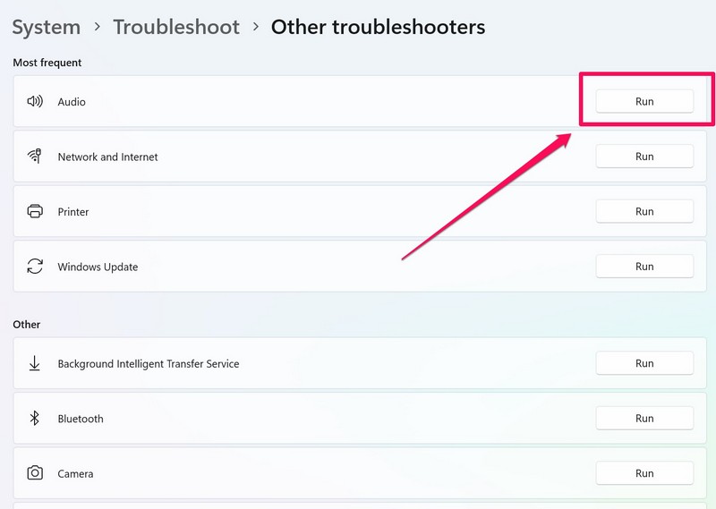 4。次に、をクリックします走るの横にボタンオーディオ最初にトラブルシューティングを行い、プロセスが完了するのを待ちます。
