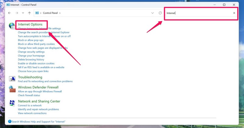 3。今、コントロールパネルの検索バーを使用します見つけるためにインターネットオプションそして、そのオプションをクリックします。