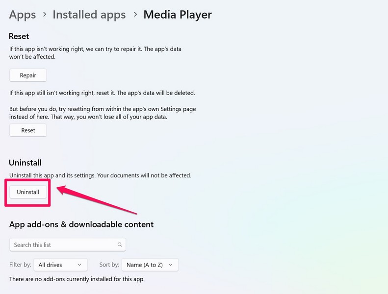 Media Playerアプリを更新しても、Windows 11のPCやラップトップで問題が解決しなかった場合、次に試してみるのに最適なことは、アプリを再インストールすることです。デバイス上のメディアプレーヤーアプリをアンインストールして再インストールすると、Windows 11で問題が発生していないメディアプレーヤーを修正するのに役立つ可能性があります。したがって、下の手順に従ってください。