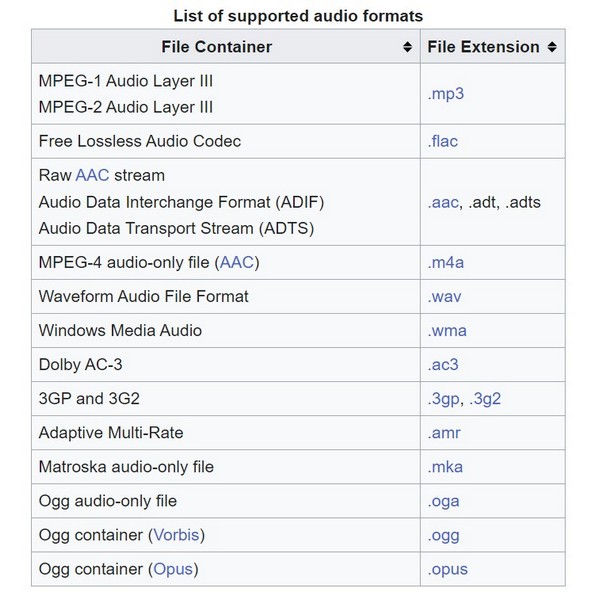 以下の画像をチェックして、Windowsメディアプレーヤーがサポートするすべてのオーディオファイル形式を確認してください。