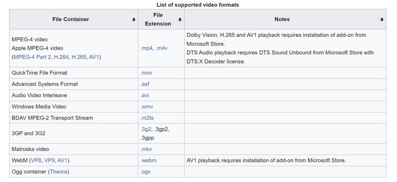 Windowsメディアプレーヤーがサポートするビデオファイル形式は、次のスクリーンショットにあります。