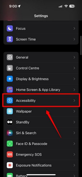 2。を見つけますアクセシビリティリストのオプションをタップして開くようにします。