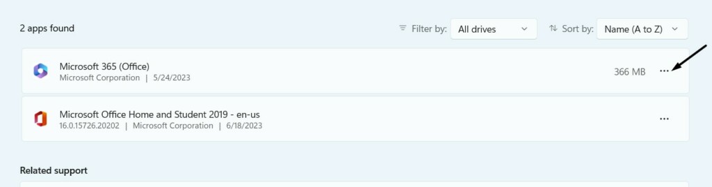 1。検索するマイクロソフトオフィスでアプリのセクション設定クリックします3つのドット(…)その隣。