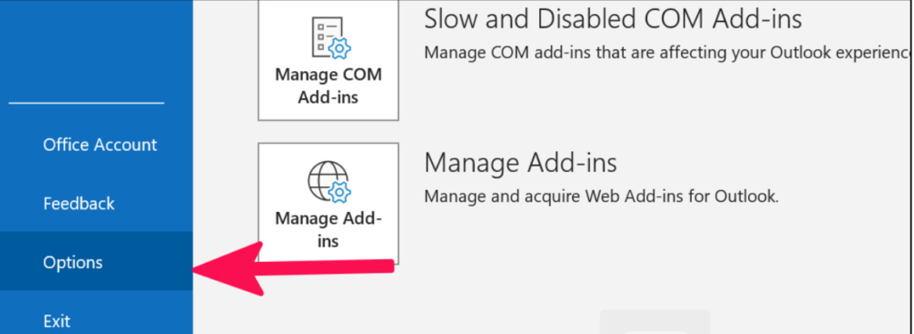 2。選択しますオプション左ナビゲーションペインから選択しますアドインを管理します右画面に。