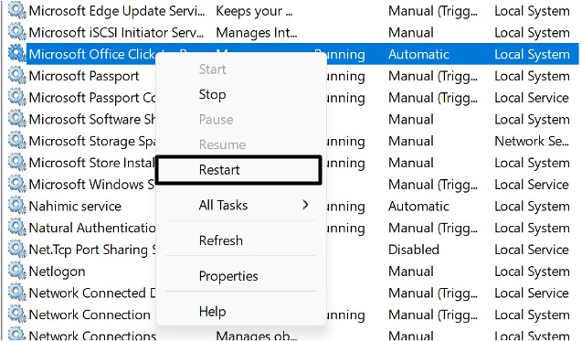 Microsoft Office Click-To-Run3。このサービスを右クリックして選択します再起動またはリフレッシュしますメニューから選択したサービスを再起動します。