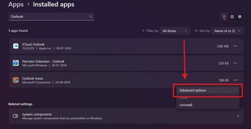 3。上記の検索バーを使用して、を見つけますOutlookアプリクリックしますその他のオプション(3ドット)ボタンそれのために。