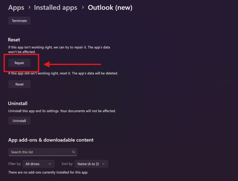 アカウント関連の問題とは別に、Outlookエラー3399811147は、Windows 11 PCまたはラップトップのOutlookアプリ内の技術的な問題のために表示される可能性があります。この場合、Windows 11の組み込みツールを使用して、デバイスのOutlookアプリを修理および/またはリセットすることができます。これらのシステムツールは、Windows 11のWindows Settingsアプリ内のOutlookアプリで利用できます。次のサブセクションをチェックして、それらを使用してOutlookアプリを修復またはリセットする方法を学びます。