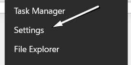 1。を右クリックしますスタートメニュータスクバーで選択します設定ポップアップからのオプション。
