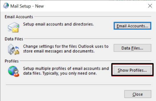 2。クリックしますプロファイルを表示…のボタンメールのセットアップ - 新しいプロンプトしてからクリックします追加…