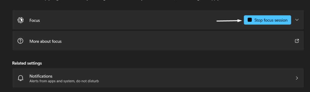 2。クリックしますフォーカスセッションを停止します下のボタン集中フォーカスアシスト機能を無効にするセクション。