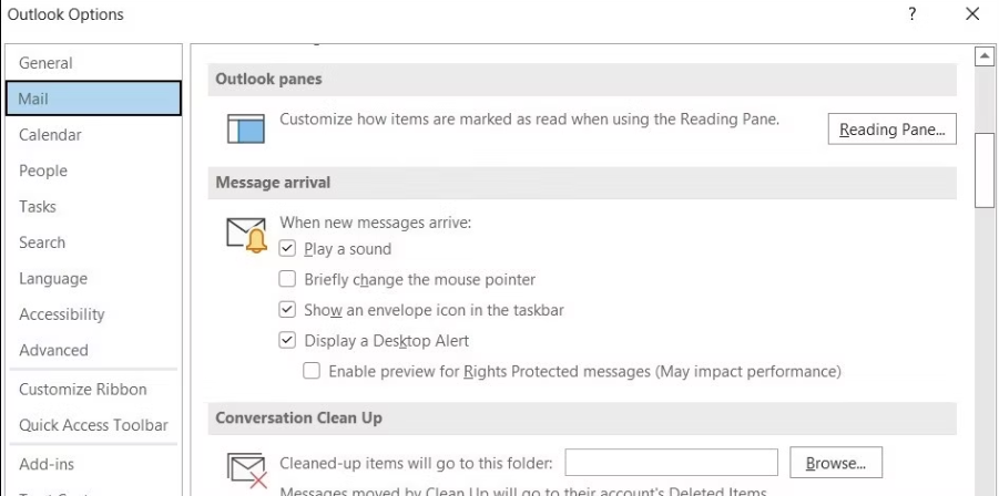 Microsoft Outlookの通知設定に移動して、以下のパスに従って有効にします。
