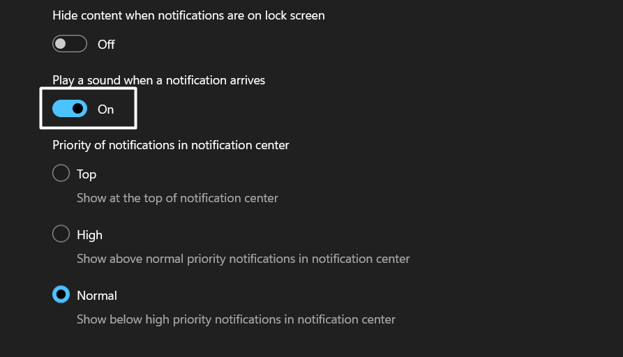 6。最後に、それを確認します通知が届いたら音を再生しますスイッチがオンになっていますアクションセンターでの通知の優先順位オプション に設定されていますトップ。