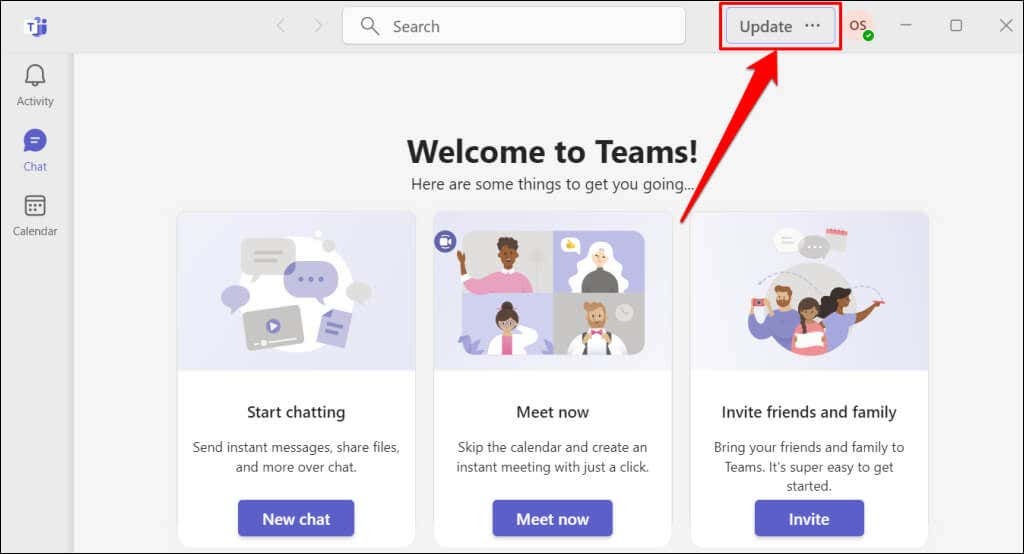 1。起動しますMicrosoft TeamsアプリPCでクリックしますアップデートまたは3つのドット(…)トップメニュー。
