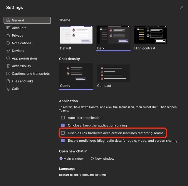 3。で一般的なタブ、チェックアンGPUハードウェアアクセラレーションを無効にする(再起動チームが必要)。