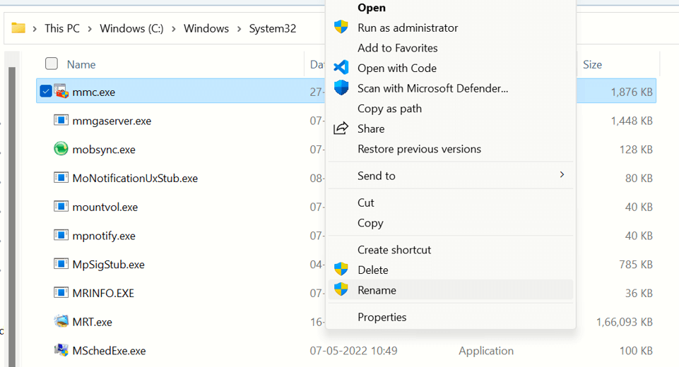 MMCを修正する1つの方法は、Windows 11でスナップインエラーを作成できませんでした。現在のMMC実行可能ファイルの名前を変更することです。 Windowsがプログラムされているため、古いMMC.exeファイルが不足している場合は、新しいMMC.exeファイルを生成するため、心配しないでください。ここにステップがあります: