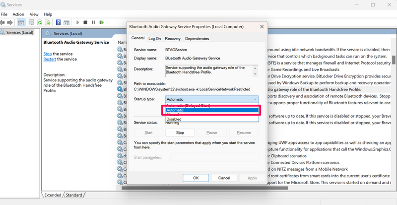 5。完了したら、隣のドロップダウンをクリックしますスタートアップタイプ:を選択します自動オプション。