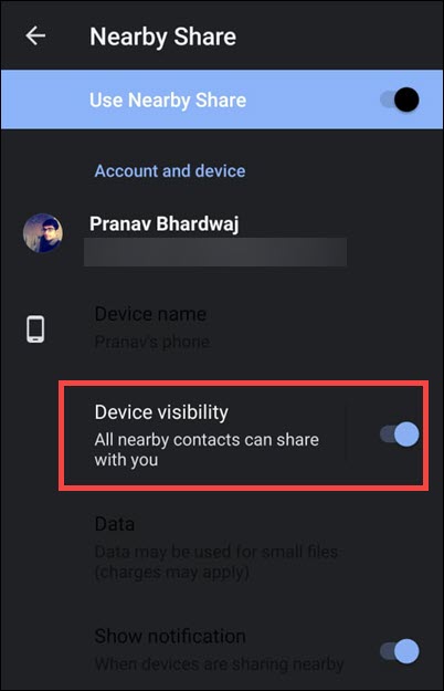 3。「デバイスの可視性」オプションを探し、その横にあるボタンがオンになっていることを確認してください。そうでない場合は、トグルをタップして有効にしてください。