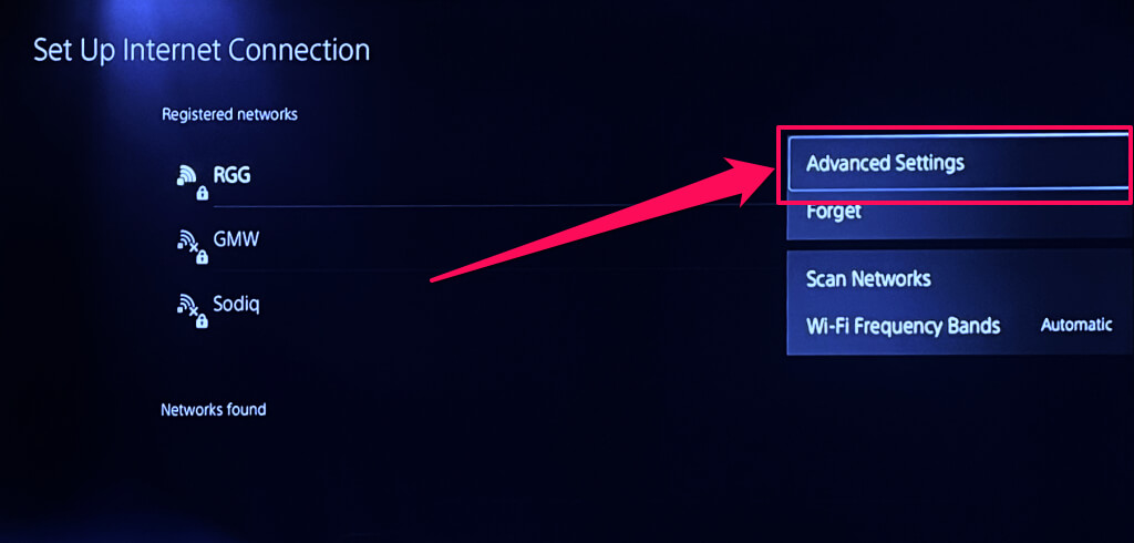 行きます設定>ネットワーク>設定>インターネット接続を設定します、ネットワークに移動し、押しますオプションコントローラーのボタン。次に、選択します高度な設定[ネットワーク構成]画面を入力します。