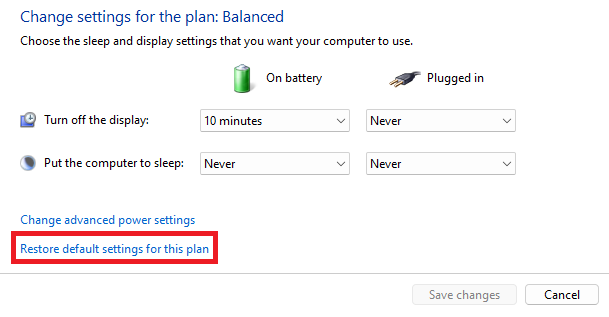 5。次の画面で、選択しますこの計画のデフォルト設定を復元しますクリックしますはい確認ポップアップのボタン。
