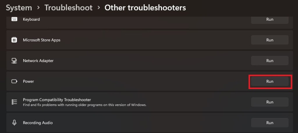 4。下にスクロールしてクリックします走るの隣のボタン力トラブルシューティング。