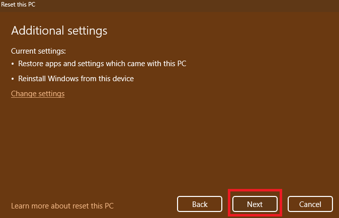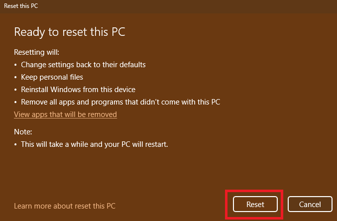 7。クリックしますリセットプロセスを開始するボタン。