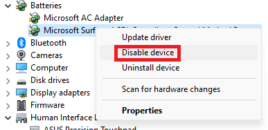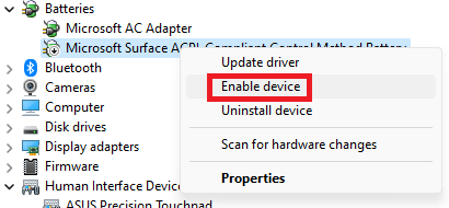 3。右クリックしますMicrosoft Surface ACPI - 準拠制御方法バッテリー選択しますデバイスを無効にします。