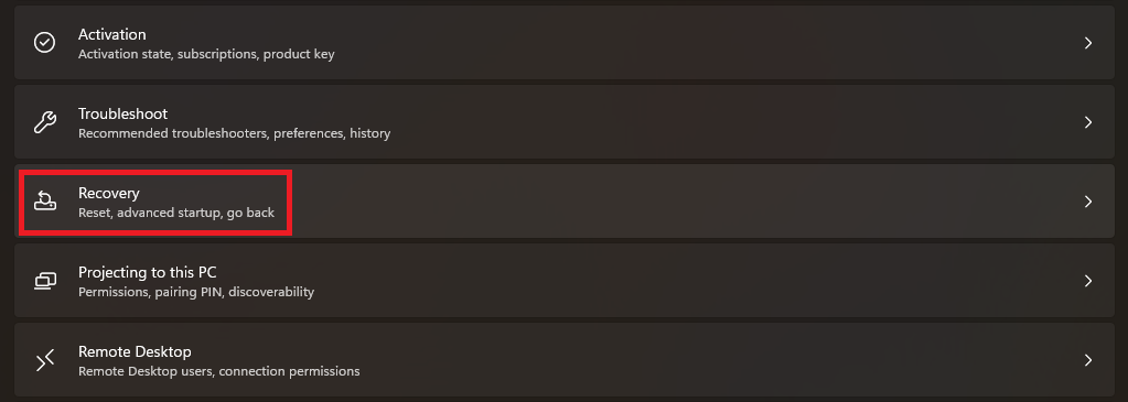 1。[スタート]メニューの検索バーを開きます回復、を押します入力キーボードのキー。