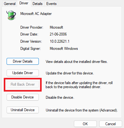 3。に向かいますドライバセクションとクリックしますロールバックドライバー。このプロセスを繰り返しますMicrosoft Surface ACPI - 準拠制御方法バッテリー、そしてラップトップを再起動します。