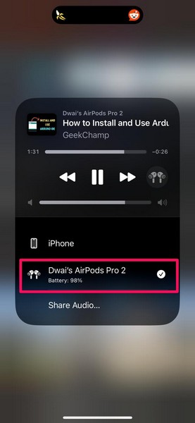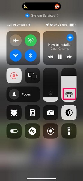これで、iPhoneが外部デバイスからオーディオを再生している場合、関連するアイコンを表示しますボリュームバー内。たとえば、以下はiPhoneがAirPodsを介してオーディオを再生することを示すスクリーンショットです。