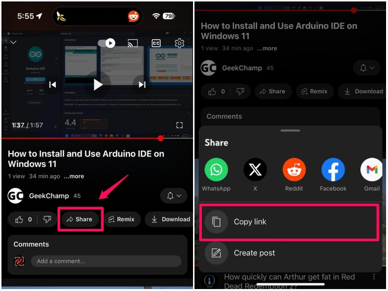 再生中のビデオがiPhoneで適切なオーディオを持っていることを確認するために、ブラウザアプリで再生して、サウンドを再生するかどうかを確認できます。したがって、タップします共有YouTubeアプリのビデオのボタンとコピーリンクオプションを押します。
