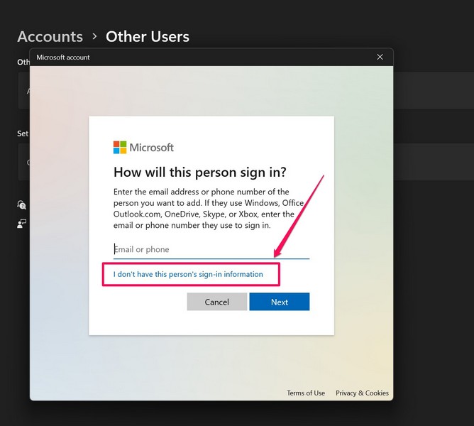 4。サインインプロンプトが開いたら、クリックします私はこの人のサインイン情報を持っていませんオプション。