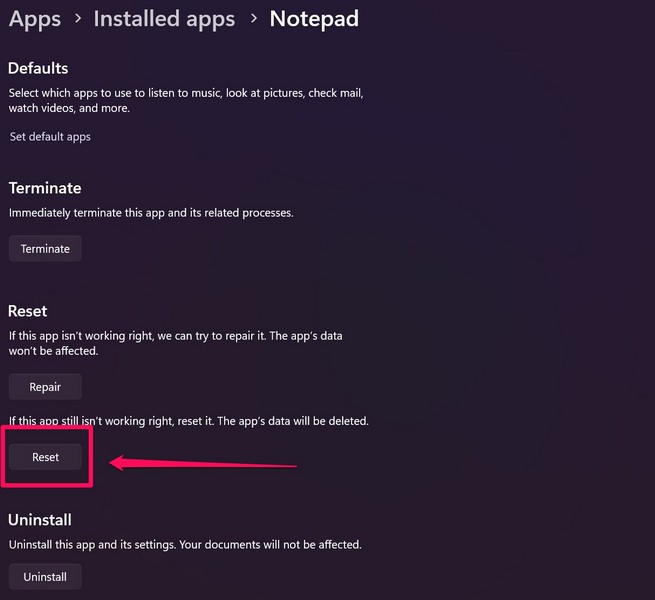 PCまたはラップトップのWindows 11 Issueで動作しないメモ帳を修正しようとする次のことは、メモ帳アプリケーションを修理またはリセットすることです。アプリケーションの修理またはリセットの修理またはリセットは、多くの場合、Windows 11で誤動作している可能性のある小さな問題とグリッチを修正します。