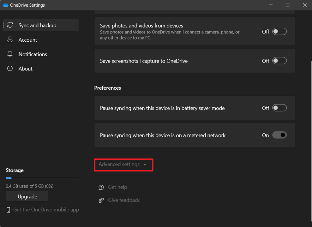 4。また、より多くの同期関連オプションを見つけることができます同期とバックアップセクション。