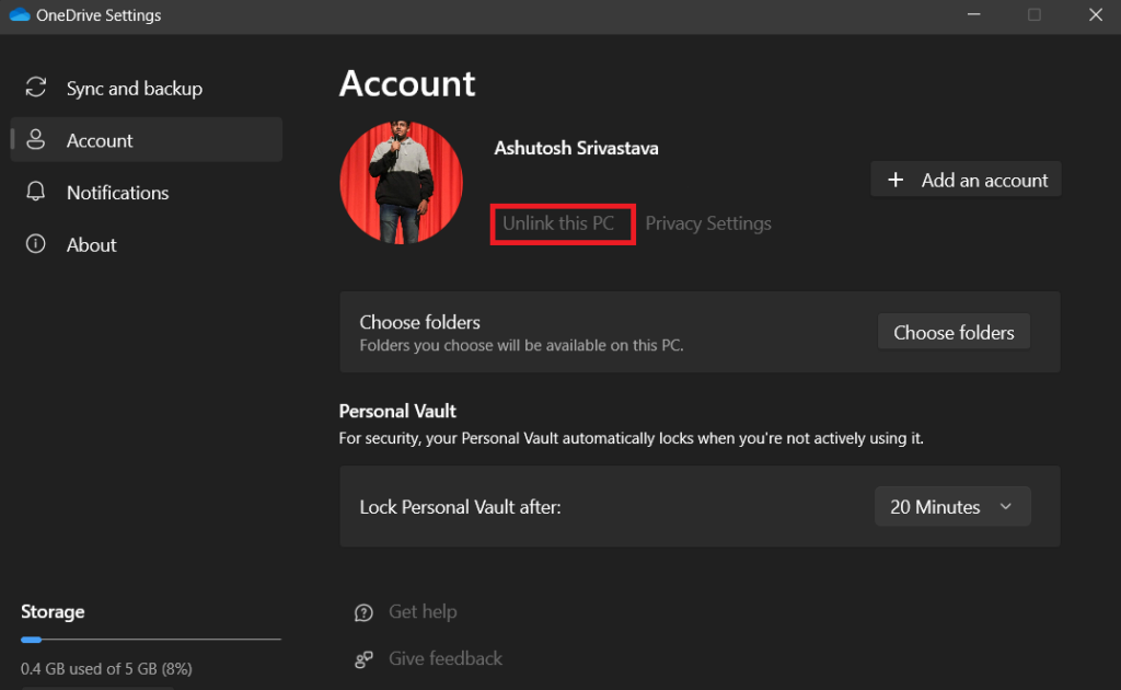 リンクプロセスは、アカウントとOneDriveサービスの間の接続を再表示し、同期プロセスを妨げる可能性のある長引く問題を排除する可能性があります。これがあなたがそれを行う方法です: