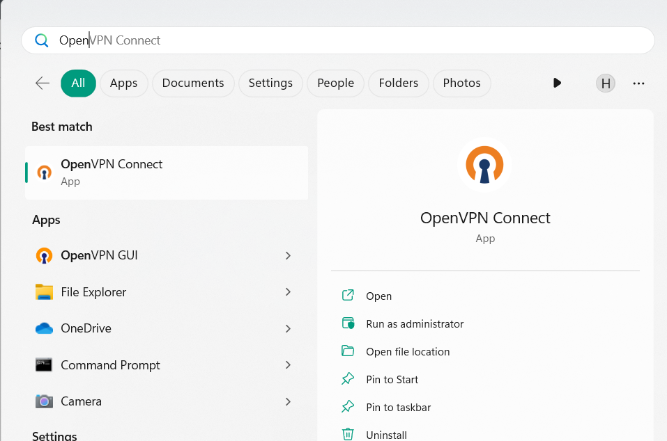 2。でWindows検索ボックス、 タイプopenvpn選択します管理者として実行しますそれから。