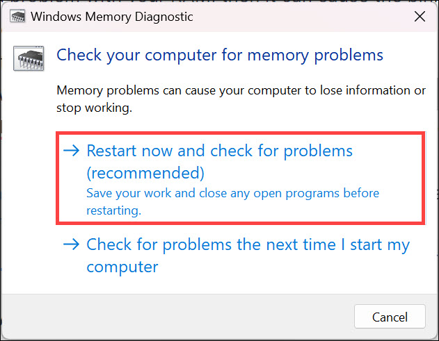 2。を選択します'今すぐ再起動して問題を確認します(推奨)'ツールを起動するオプション。